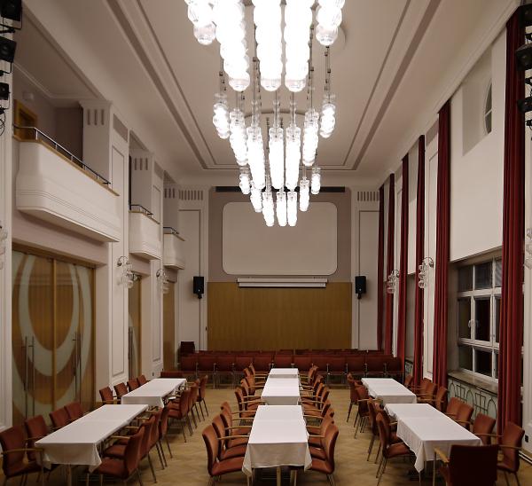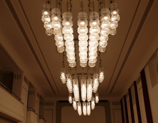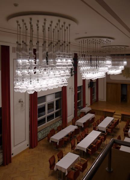 - Music hall, lounges in second and third floors and administrative spaces. There are installed tubes and LED lights. Foxtrot here also integrates jalousies and blinds, prepared light scenes in each area according to user requirements. In music hall there are original bulb lights from 50th of 20th century. Three chandeliers, each one consists of 37 pc of glass globes. Originally it was equipped by 60W bulbs. Chandelier has been renewed, 60W bulbs has been replaced by LED bulbs 7W. Circumference of the hall has been completed by LED stripes. Control of each chandelier is divided into 5 groups. Central control of the music hall is from place of music direction.
