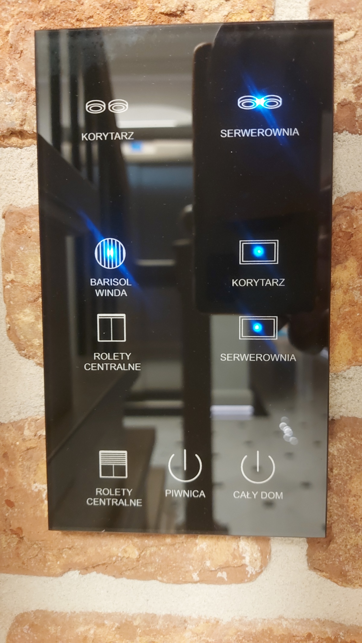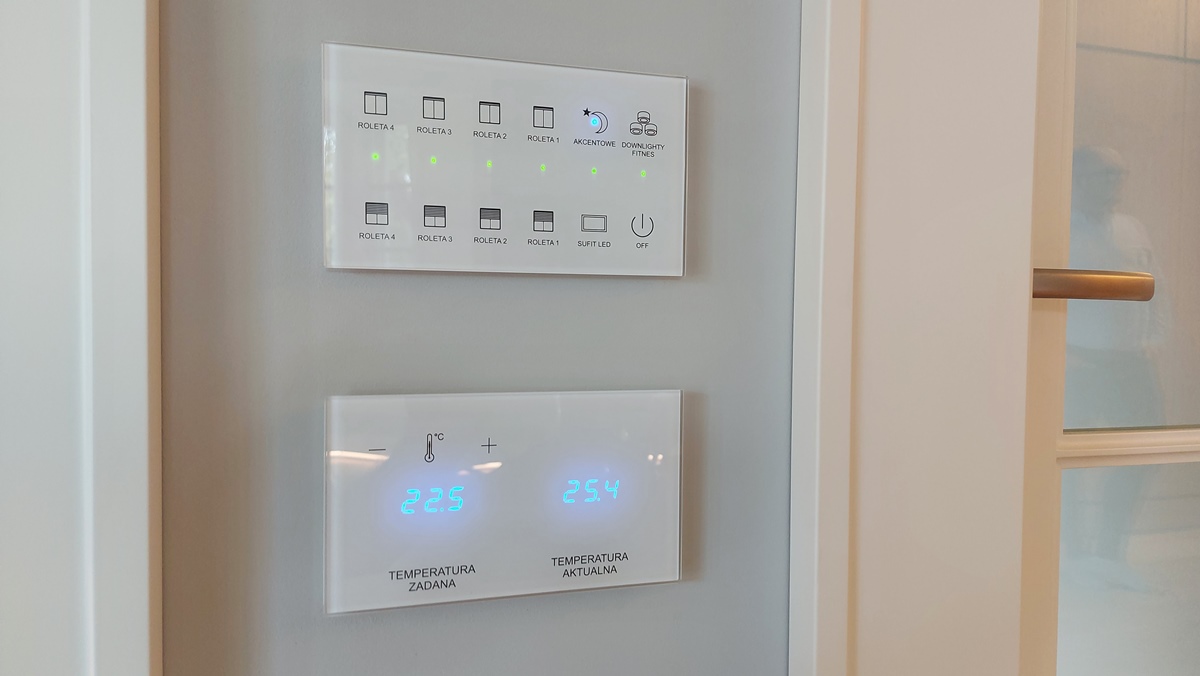 The most of used switches are modern glass touch switches with RGB backlight and integrated LCD display. Switches are able to display the local temperature in individual zones, outdoor temperature, air humidity or air quality using CO2 sensors.