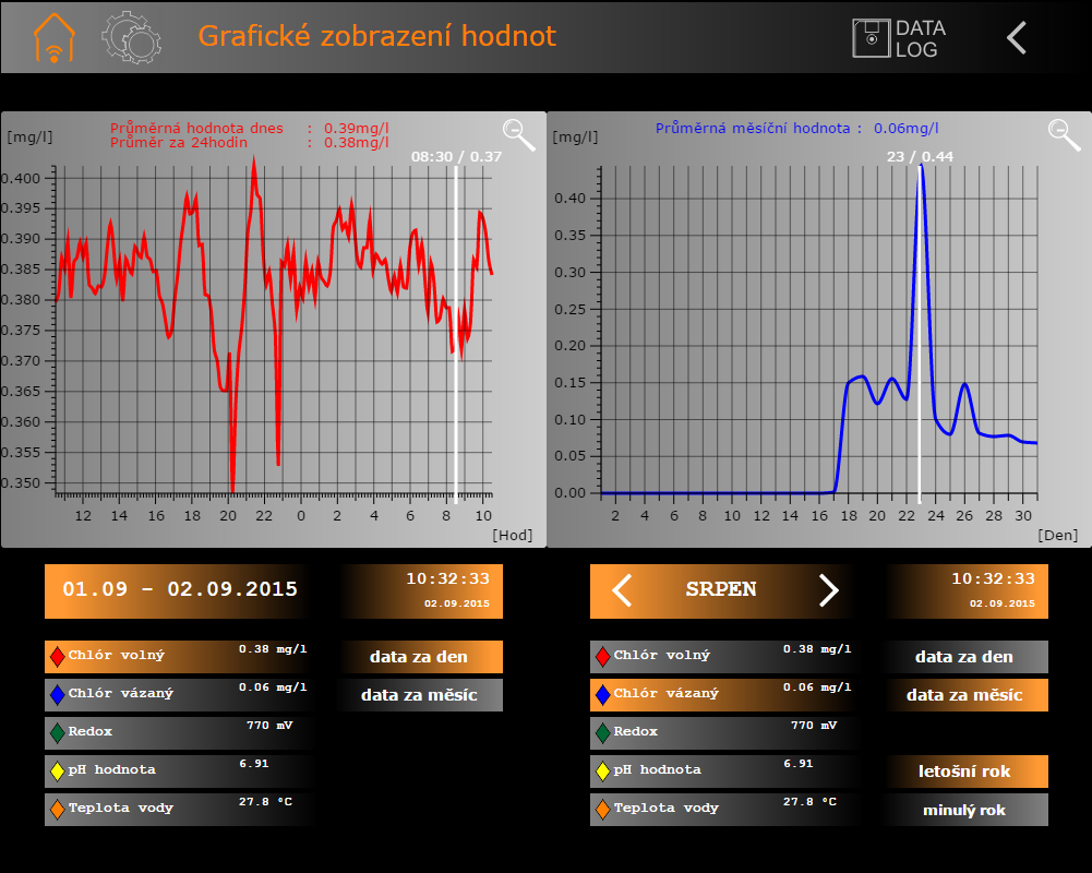 Control system contains of control cabinet equipped by central module Tecomat Foxtrot CP-1006 and peripheral modules on CIB bus, which are connected to chemistry metering board in water treatment station. All measured data and information of statuses are visualized on web pages. Measured data are displayed in two graphs with independent choice to display required measured value. In each graph we can display daily values per 10 minutes or monthly average values. All measured data are backed up into database file for next analyse needs.