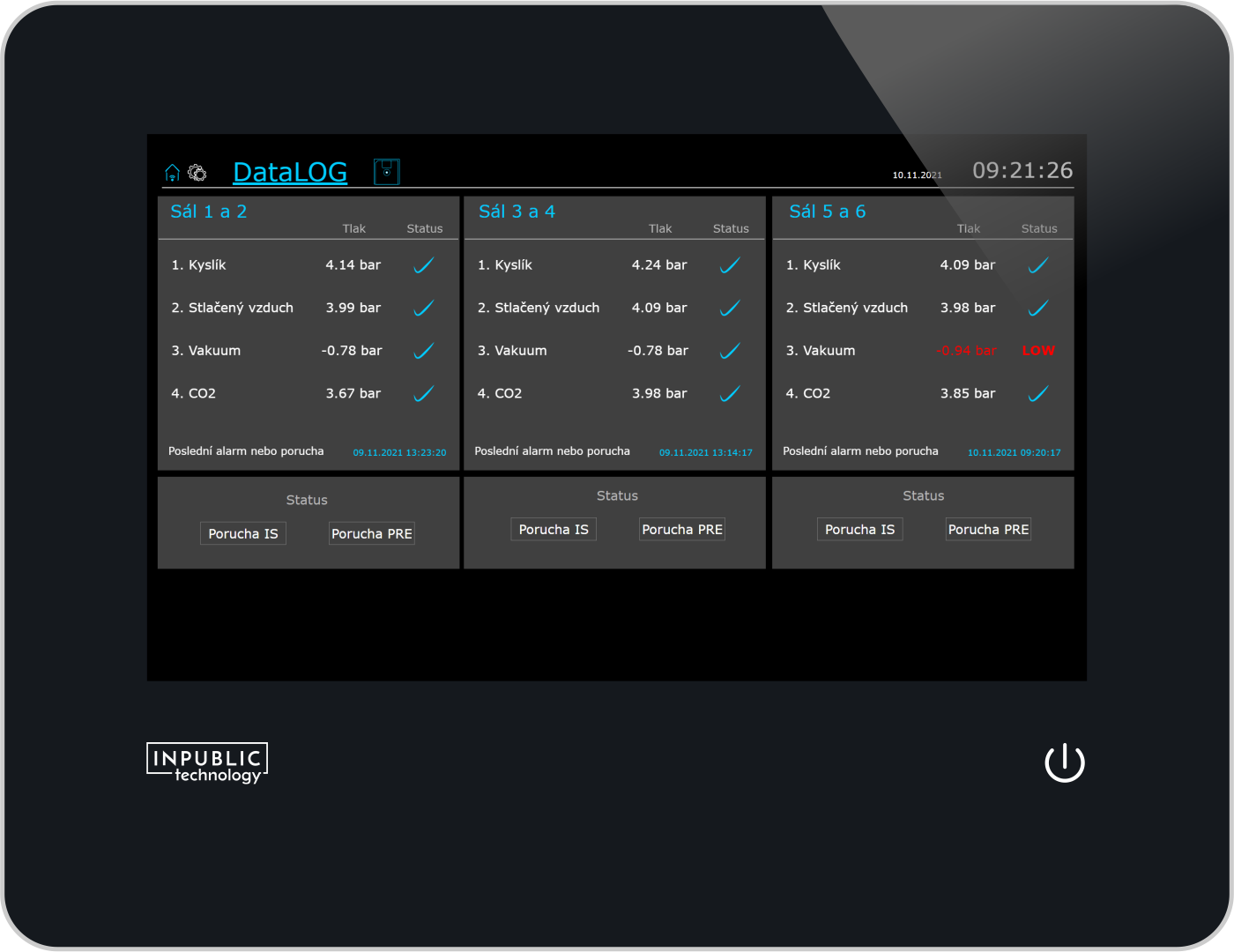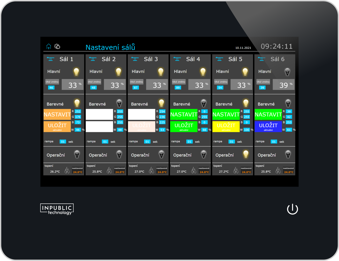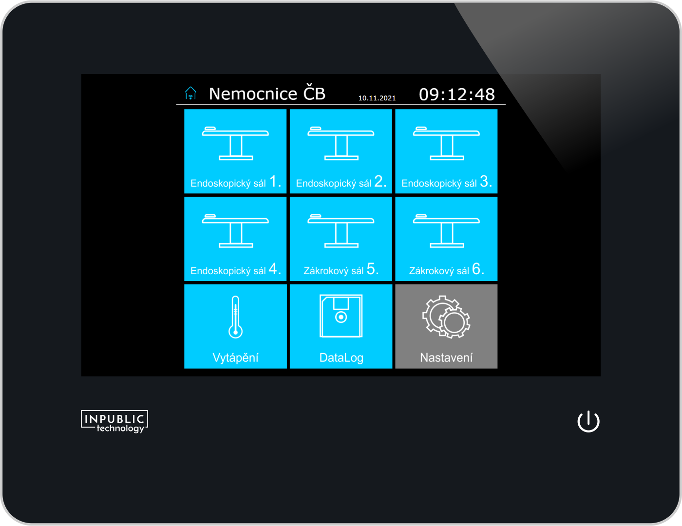 The actual control of the halls is realized on six recessed glass touch panels with a screen size of 22" with FullHD resolution, on which a visualization of the control of each hall is displayed. These touch screens are located inside the hall, so they must meet the specific conditions of the hospital environment. The goal was to solve an intuitive graphical interface through which all the necessary functions would be available on one screen. Visualization of the hall includes setting the lighting, monitoring the medical gas pressure values and their alarms in case of values outside the required range. Faults in the insulation system are also signaled - overheating of insulation transformers and insulation condition.