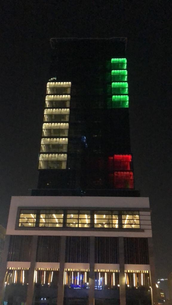 The high-rise Tujjar building is illuminated from the outside with 14 LED light strips, which, thanks to the Tecomat Foxtrot control system, enable the building to be illuminated in various colors. Groups of lights can also create different shapes, giving the building a unique look.