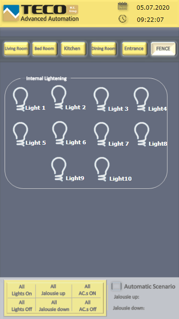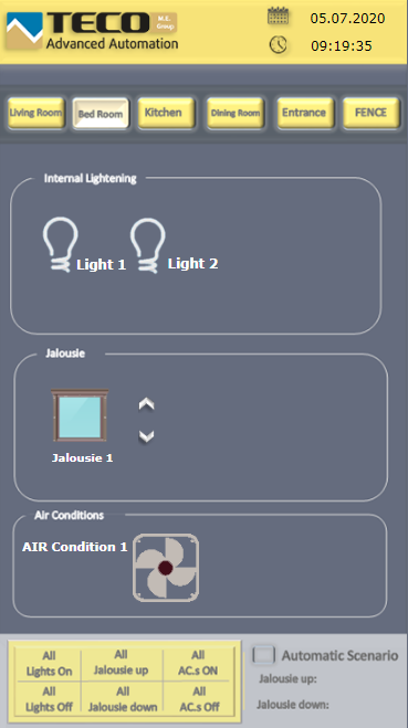 Thanks to our system, the inhabitants of the apartment have the opportunity to comfortably control not only its internal lighting, but also the outdoor lighting that is on its outer walls from one place by simply touching the screen. Furthermore, they can also control all air conditioning units located in the apartment, as well as blinds in all rooms of the apartment.