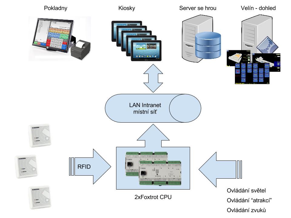 - RFID readers of games are connected with system Tecomat Foxtrot by RS-485 bus. System Foxtrot is identifying the player in the game and in case of need communicates with game server.