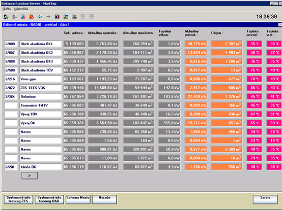In 2007, Slovteco s.r.o. company implemented a new heat control room for the purposes of controlling the hot-water heat distribution system and metering heat consumption. To control the hot-water heat distribution system, Tecomat TC650 PLCs and CONEL radio/GSM modems were employed. Data from the distribution system is transmitted over a radio network, which consists of three Tecomat PLCs and eight AMiT controllers.