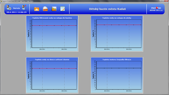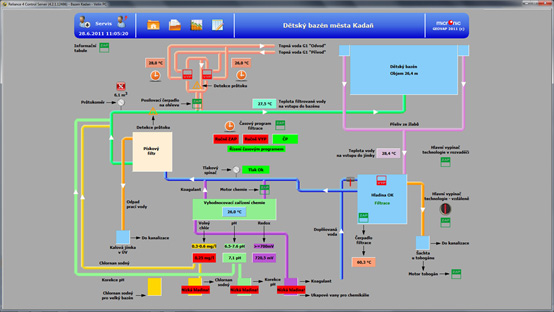 In the first half of 2011, a control and visualization system was implemented at Kadan Swimming Pool. The system is designed to control and monitor the water filtering and heating process for the children's pool. The control system is based on Tecomat Foxtrot controllers. The complete control system was implemented by MICRONIC Prerov s.r.o.. To provide comfortable visualization and control of the water filtering and heating process, the Reliance SCADA/HMI system from company GEOVAP spol. s r.o. was chosen.