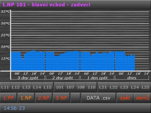 Full-blown user control of all technologies via web interface. There are available optional parameters of ventilation, central heating and for heating/air conditioning of all rooms and spaces. Settings contains operation modes, temperature comfort settings and time programs. There are available temperature graphs for each room with history. Temperature history is stored to table in csv file format.
