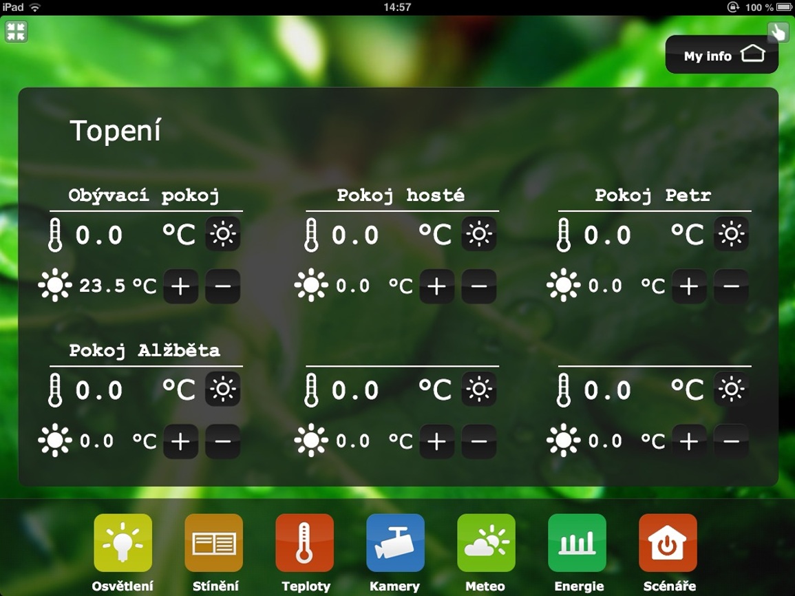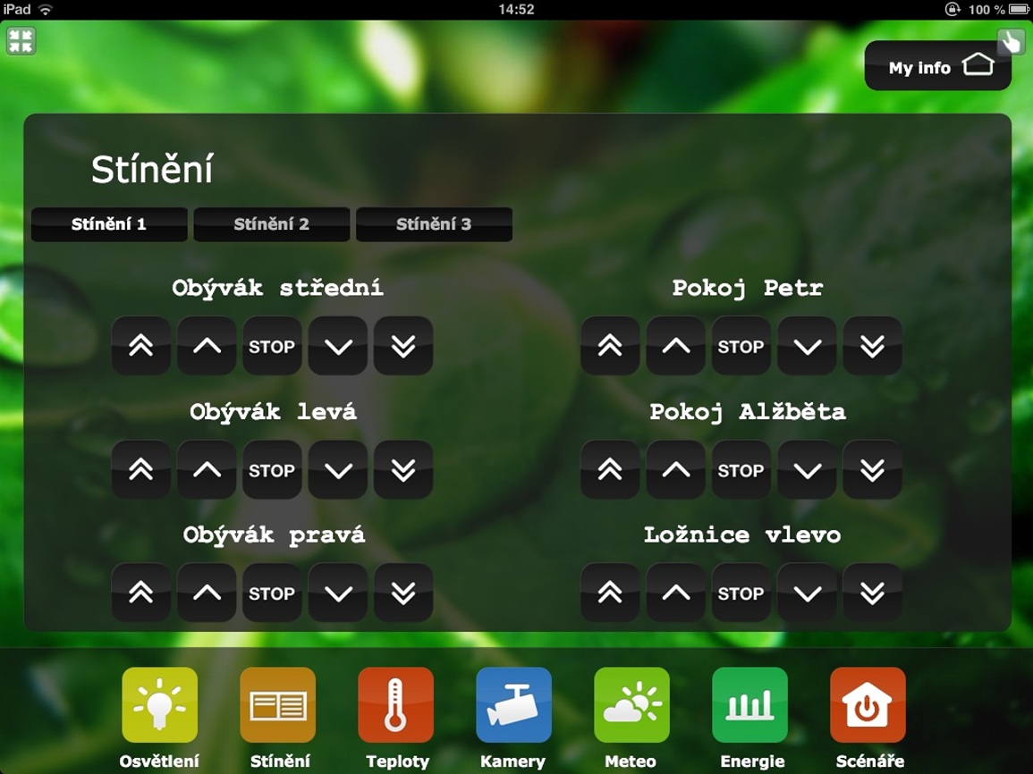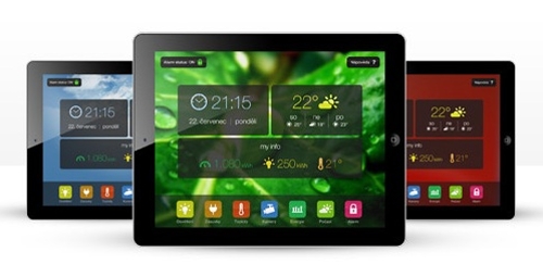 Smart switchboard - type TRE, equipped by Tecomat Foxtrot, here controls following: lights control, exterior blinds, floor heating, wi-fi and alarm security system, all even from iPad and tablets. It also measures energy consumption of both independent flat units.