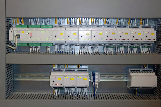 The control system consists of two PLCs. One is used to control the operation of the gas boilers. It is installed in the gas boiler room's switchboard. The other PLC is used to control the HVAC system. It is installed in a switchboard located in the technical mezzanine. Both controllers communicate with each other via PLCNet.