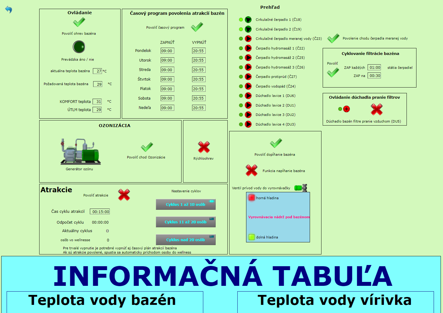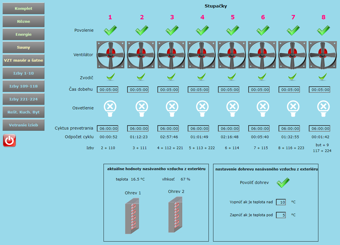 Hotel wellness has been innovated too. Foxtrot here controls drinking water finishing technology (filtration, chlorination, ozoning), heating the pool and whirlpool water and pumps for pool attractions. In the pool hall has been mounted TV screen, displaying all important data for guests – water temperature in pool and whirlpool, air humidity, time and outside temperature. In fittness hall there are installed temperature sensors, CO2 sensors and occupancy sensors and according to data from these sensors Foxtrot automatically controls ventilation and air heating from HVAC unit, which is connected to Foxtrot by Modbus TCP. Relaxing and sauna part of wellness has been refurbished too. Access to this part is controlled by gate. Visitors are getting contactless wristband, giving them access. According to number of people in wellness, Foxtrot controls automatically each attractions and operation cycles.