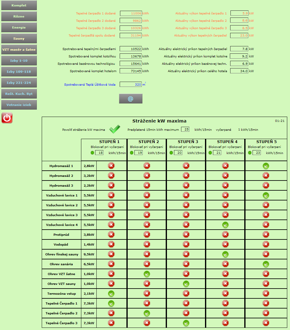 Another important task for Foxtrot was water management system control. Hotel is located in outlying mountain area with lack of drinking water, so precise water managenet is a must. Water for the whole hotel complex is pumped from mountain creek to hotel water finishing technology room, where all finishing technology runs and after this proces the water is pumped to the water tank. The tank is monitored and in the case of level decrease, hotel staff is alarmed.