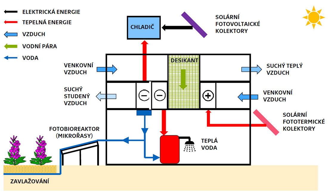 The S.A.W.E.R. unit can be operated in a totally autonomous way without the need of energy from external sources. The energy for its operation (electricity, heating. cooling) is taken from the local environment by solar roof. The energy is stored in the battery repository and the storage tanks of heat and cold. The device can also work in hybrid mode, ie. with partial or complete connection to the mains or mobile power supply. The S.A.W.E.R. it is therefore suitable both for areas connected to infrastructure (water, electricity) and especially for areas where there is no infrastructure. Therefore, the S.A.W.E.R. unit is suitable for areas without any infrastructure at all. The technology is optimized for operation in hot and dry climates (deserts); however, the process can be also adapted for other areas.