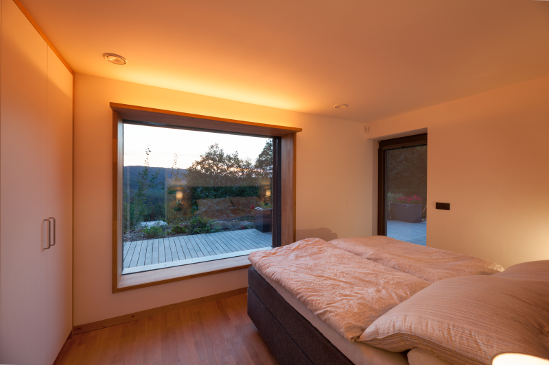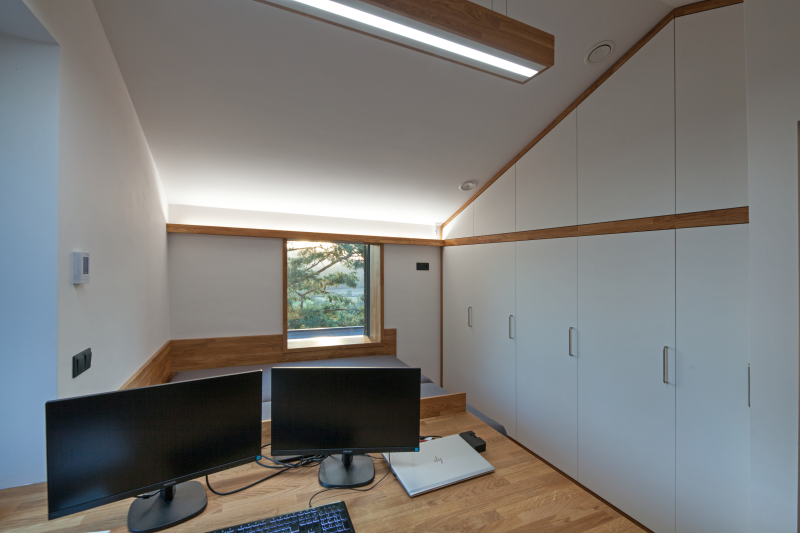 The originally intended direct and spot lighting was replaced by indirect lighting, and biodynamic lighting was also used, from which the blue component of the spectrum disappears in a controlled manner in the evening and at night, just as in nature. In the bedroom and bathroom, more natural lighting was realized from the ground. On / off control is realized by standard switches on the wall. In parallel, and if necessary, then remotely e phone or tablet.