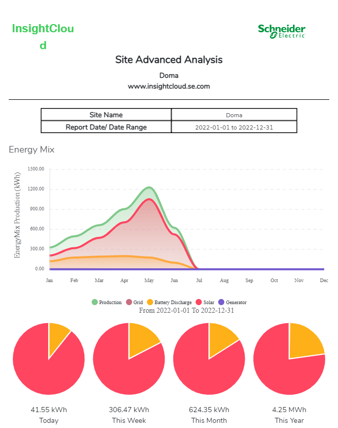 This prevents overflows of the energy produced by the PV plant into the grid (which is not economically advantageous for the owners of the PV plant) and the maximum of the produced energy is consumed directly in the building. Graphs of energy produced are available to the user.