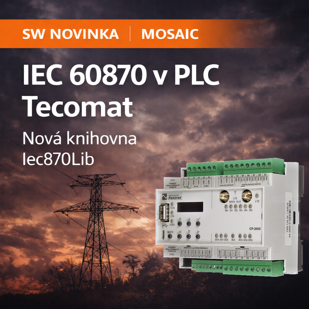 26. 1. 2026 SW novinka – PLC generuje QR kód z libovolného textu Řídicí systémy Tecomat Foxtrot a TC800 nyní umožňují přímo z PLC programu generovat QR kódy z libovolného textu – bez externích nástrojů a bez závislosti... 27. 6. 2025 Nová knihovna Iec870Lib pro dálkovou komunikaci podle IEC 60870-5-101 a 104 Rozšiřujeme nabídku systémových knihoven o Iec870Lib – nástroj pro realizaci dálkové komunikace mezi řídicími systémy Tecomat Foxtrot / TC800 a nadřazenými...