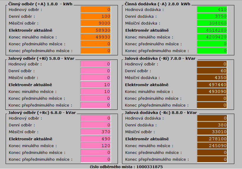 - sledování stavu elektroměru ČEZ – prostřednictvím datové komunikace, která je opět realizována pomocí PLC Tecomat Foxtrot, jsou přímo z elektroměru vyčítána data o výrobě a spotřebě (kWh) a jalových složkách (kVar).
