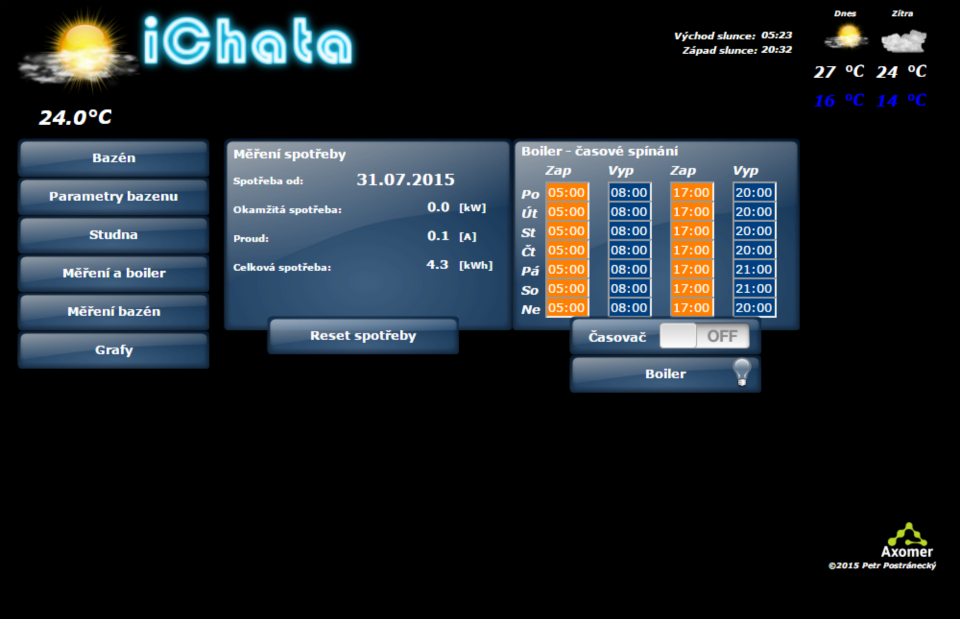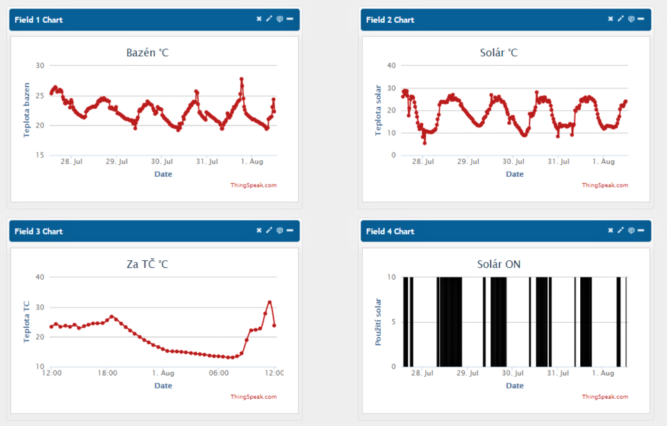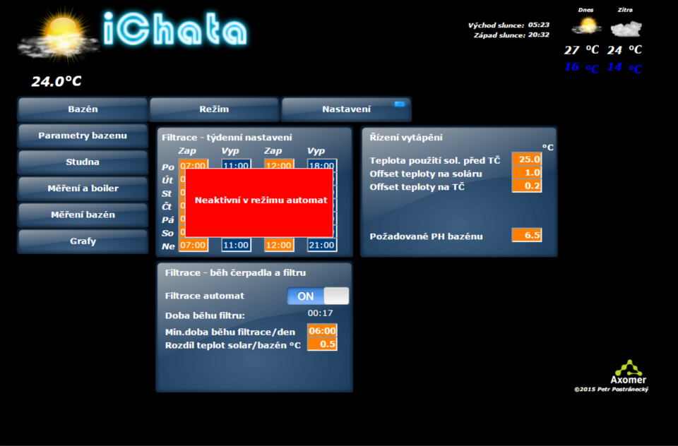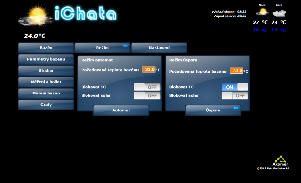 Byl jsem požádán, abych vytvořil automatické ovládání a řízení venkovního bazénu na jedné nejmenované chatě u Brna. Pro ohřev je použito stávající tepelné čerpadlo a solární termický panel na střeše chaty. Uživatel si pouze vybere požadovaný režim bazénu a o vše se již postará automatika, která si sama zvolí nevhodnější zdroj ohřevu a podle potřeby i mezi nimi přepíná elektrickým ventilem. V projektu je použita nová knihovna pro ukládání měřených dat a jejich zobrazení. Poprvé byla navržena funkce pro spouštění filtrace pouze podle požadované doby běhu filtrace. Kdy a jak dlouho bude filtrace běžet si již systém nastaví sám.