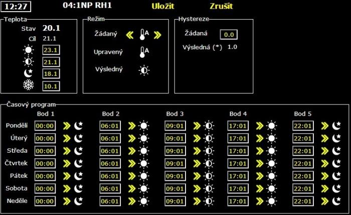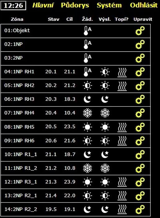 Pro každou topnou zónu je k dispozici samostatný týdenní topný program s možností až 5 změn topného režimu v každém dni. Alternativně je možné určitou topnou zónu nebo skupinu zón (celý objekt, jen 1NP, jen 2NP) přepnout trvale do určitého režimu (Komfort, Standard, Útlum nebo Ochrana).