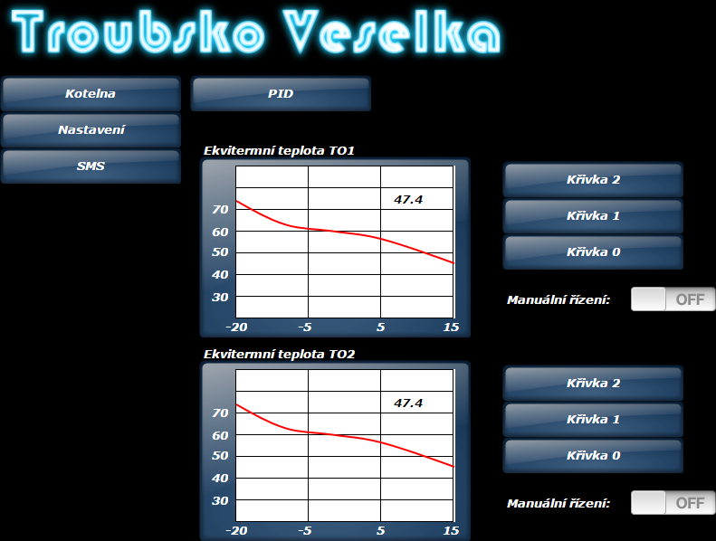 Vytápění s využitím více zdrojů energie. Cílem je automatické spuštění a řízení systému ÚT, s akumulací přebytků výkonu kotle na TP. V tomto případě je primární zdroj vytápění kotel na tuhá paliva, který energii akumuluje do dvou 1000l nádrží. Odtud je teplá voda distribuována podle požadavku systému (topit podle venkovní teploty) do dvou topných větví přes třícestné ventily (řízené PID).Těmi je výstupní teplota vody do radiátorů regulována a řízena ekvitermní regulací (dle ekvitermní křivky). Jako záloha je použit elektrokotel. Řízení výkonu elektrokotle je regulováno spínáním topných tyčí dle PID. Systém samozřejmě hlídá poruchové a poplachové stavy (přetopení, nízká teplota aku atd.), v případě potřeby zašle SMS a e-mail zprávu.