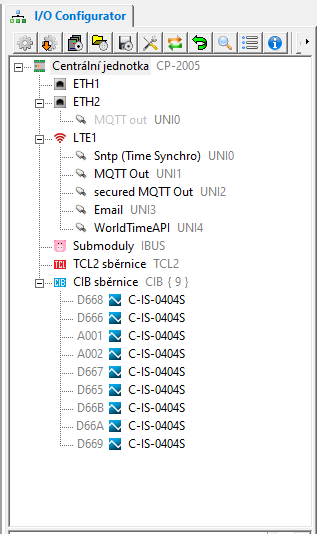 Realizace systému světových hodin je postavena na PLC Tecomat Foxtrot 2 CP-2005 s integrovaným LTE modemem a na distribuovaných modulech C-IS-0404S připojených po sběrnici CIB. Základní modul CP-2005 nabízí 2× Ethernet 100 Mb/s, USB device i USB host, 1× CIB master, 1× TCL2 master, 6 univerzálních AI/DI vstupů, 6 reléových výstupů a 2 analogové výstupy. Vestavné moduly C-IS-0404S doplňují 4× AI/DI a 4× DO; jejich výstupy lze po dvojicích použít i jako H-můstky pro řízenou změnu polarity. Sběrnice CIB je dvouvodičová, má volnou topologii, po stejné dvojici vodičů zajišťuje komunikaci i napájení modulů a na jednu větev umožňuje připojit až 32 periferií. Tato architektura je pro hodinový systém výhodná, protože umožňuje rozmístit akční členy blízko jednotlivých ciferníků a současně zachovat kompaktní centrální řízení.