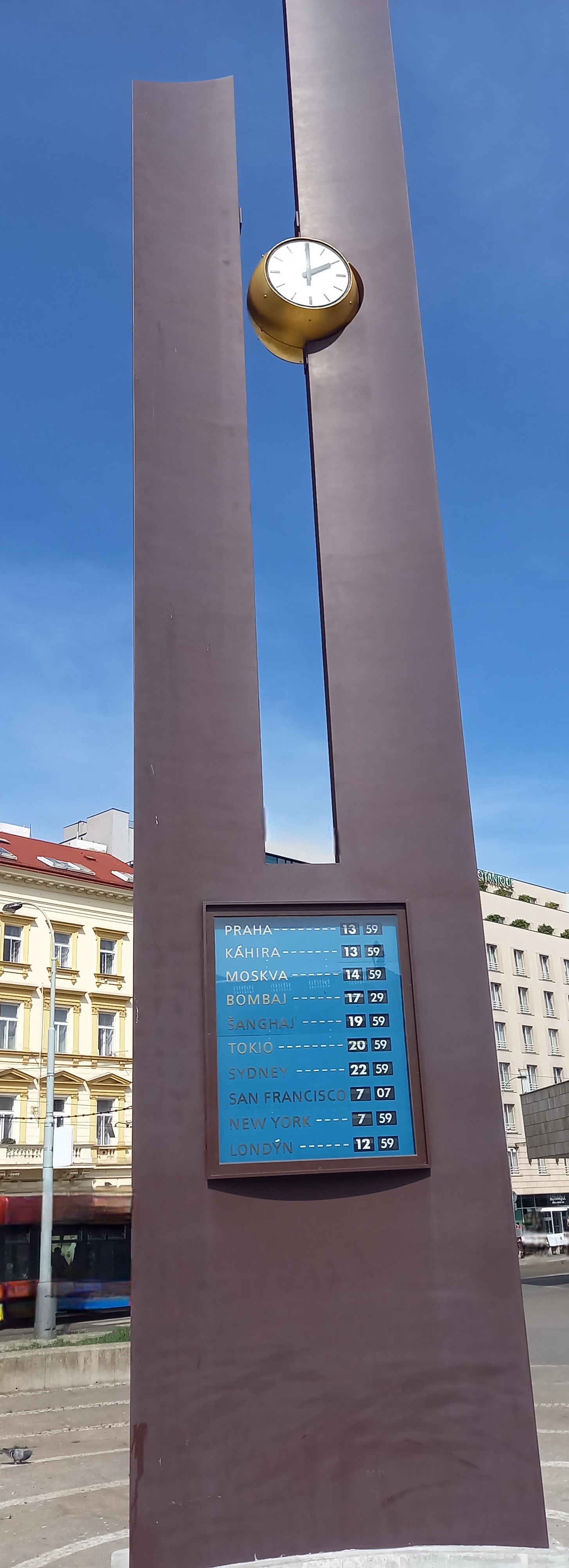 Systém řídí dvojici klasických ručičkových hodin s hodinovou a minutovou ručičkou a současně také překlápěcí 24hodinové ciferníky zobrazující čas ve vybraných světových lokalitách. PLC zajišťuje centrální synchronizaci času, pravidelně aktualizuje časové offsety jednotlivých destinací a v aplikační logice automaticky zohledňuje změny mezi letním a zimním časem. Tím je zajištěno, že všechny zobrazované časy zůstávají správné i bez ručních zásahů obsluhy.