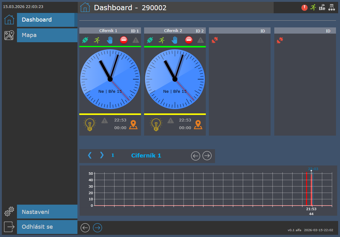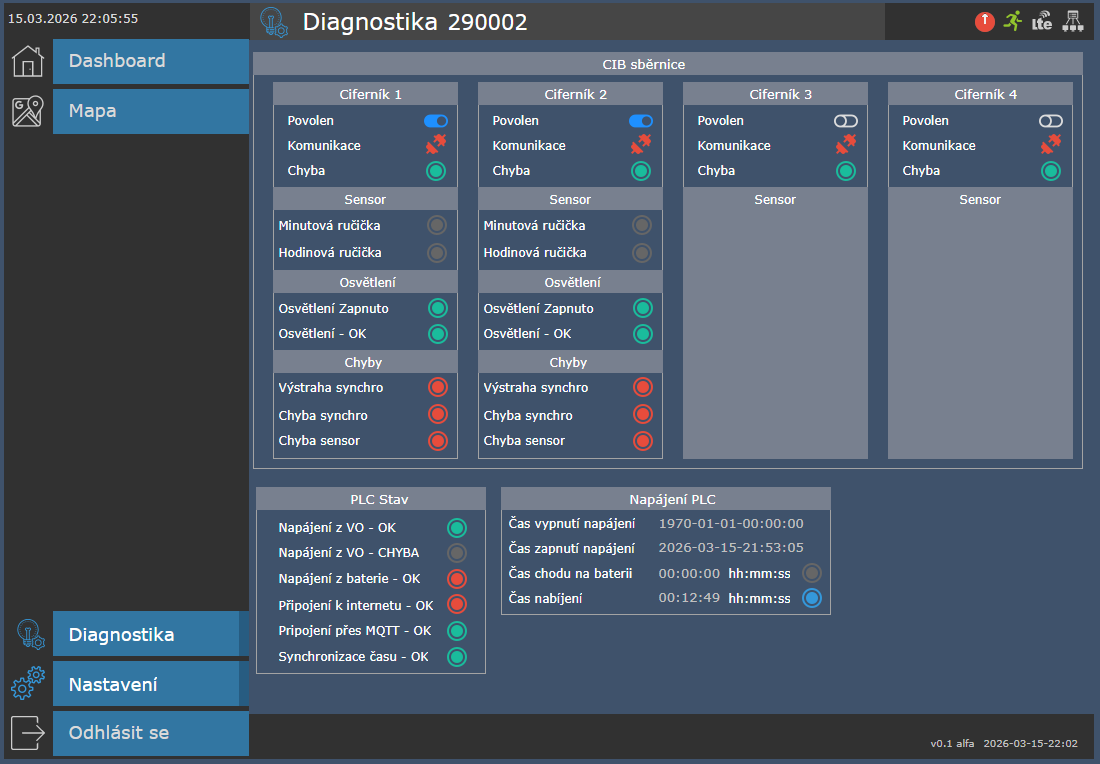 Stavové a diagnostické informace o hodinách jsou dále předávány do nadřazených systémů pomocí protokolu MQTT. Ten Teco podporuje jako lehký a komunikačně nenáročný telemetrický protokol vhodný pro IoT a vzdálený sběr dat. V praxi to umožňuje online publikovat stavy jednotlivých ciferníků, poruchové hlášky, servisní informace i provozní údaje do dispečerských, dohledových nebo cloudových aplikací.