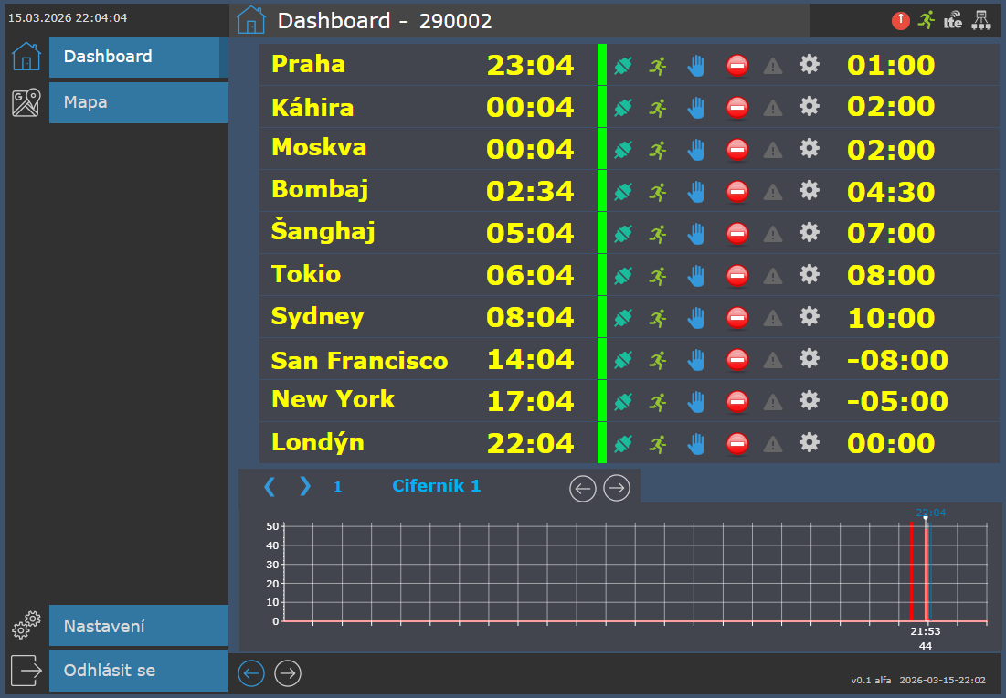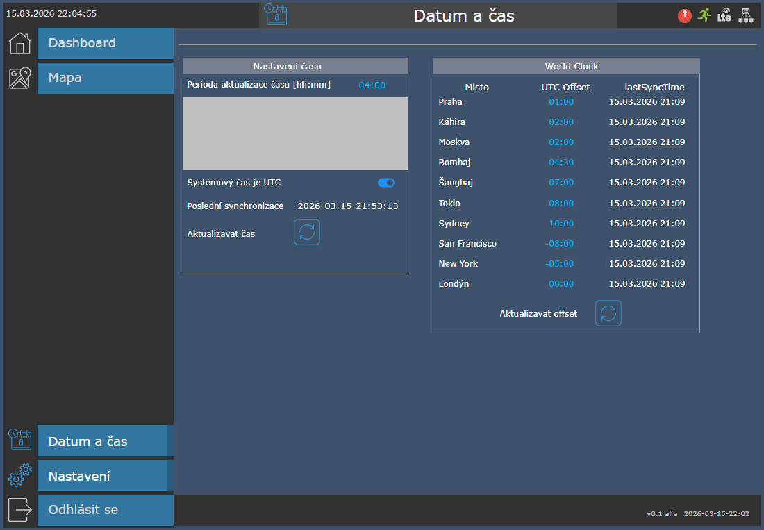 Systém světových hodin je realizován na platformě Tecomat Foxtrot 2 s využitím základního modulu CP-2005 s integrovaným LTE modemem.